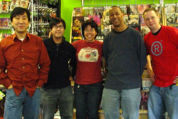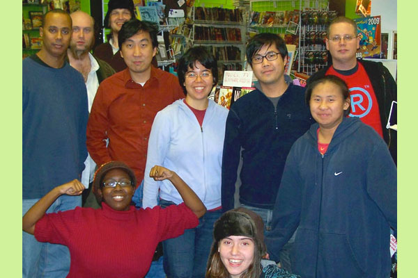 The Hub Comics 24-hour Comics crew at 3:30am, just before getting kicked out by the Somerville Police: Standing are Yours Truly, Sean Downey, Chris Little, Hyun Supul, Aya Rothwell, and Andy Wong. Blanking on everyone else I'm afraid.