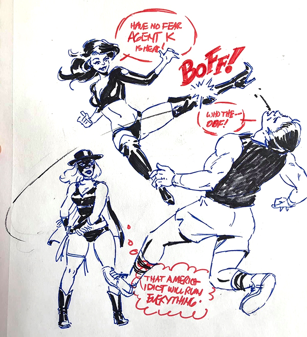 This is a merge of thumbnails with the finished script at live art size. My quick handwriting is a pretty good indication for how the lettering flows. Any wording deviations (unanticipated clarity issues, typos, new storytelling ideas) to back to the script for final art and lettering. The drawings are usually done on newsprint or tracing paper with cheap magic markers, a different color for every element (art, borders, and lettering). After the entire story's finished in script and breakdowns, it's onto producing final art!