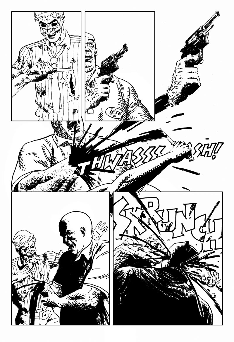 I recently took a shot at improving the art, correcting errors that've bothered me for years. In the published version, the gang's overweight leader is shirtless for no apparent reason. The drawings of his girlfriend look like I'd never seen a woman before. Digitally correcting these errors in "pencil" was easy; matching my '80s inconsistent inking style with Corel Painter was a lot tougher. In the end, I think this enhanced version looks as good as possible.