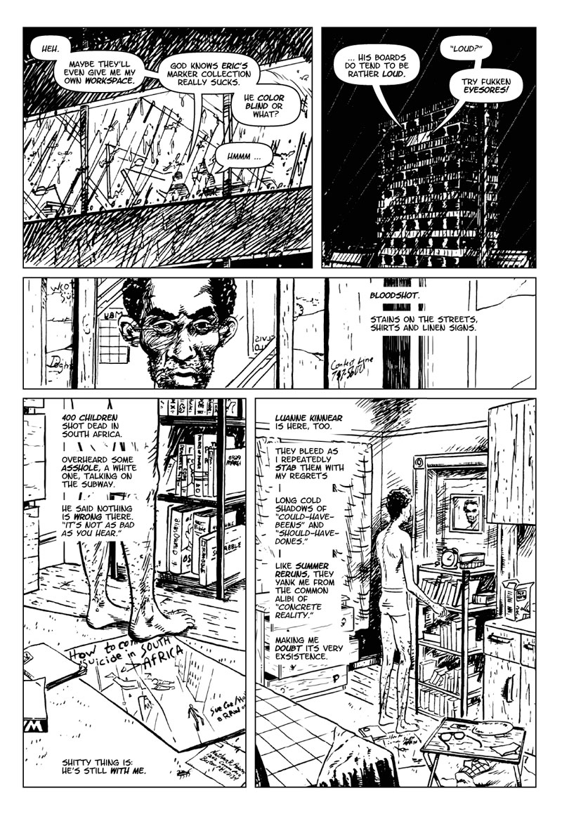Taking the example from Howard Chaykin, I started modeling the protagonists on myself. I worked at a design agency while producing this story. The depictions of the pre-digital workstations and my early '80s rooming house are 100% accurate.